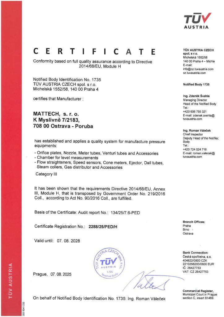 В 2001 году в компании ООО «MATTECH, s.r.o.» была внедрена система управления качеством, которая прошла успешную сертификацию английской фирмы «Lloyd´s Register Quality Assurance». В 2002–2003 гг. компания уже полностью сертифицирована по производству деталей высокого давления в соответствии с директивой PED 97/23 EC. В настоящее время система управления качеством внедрена и проходит регулярный аудит чешской фирмы «TÜV AUSTRIA CZECH».