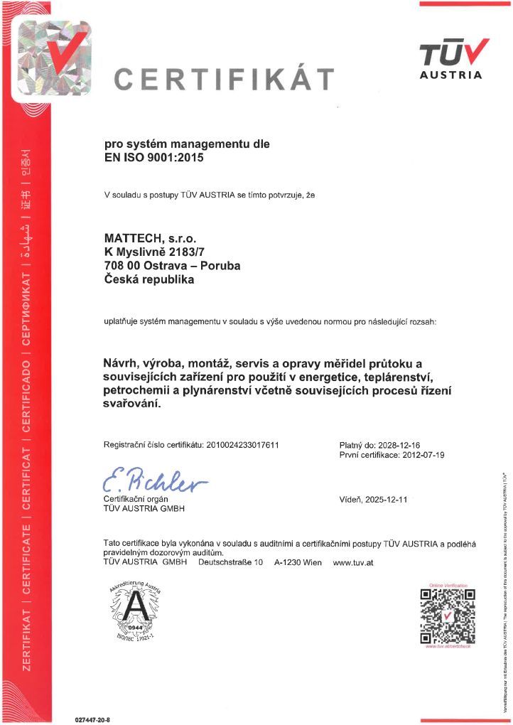 V roce 2001 byl ve společnosti MATTECH, s.r.o., zaveden a úspěšně certifikován britskou firmou Lloyd´s Register Quality Assurance systém řízení jakosti. V průběhu let 2002–2003 byla společnost již plně certifikována pro výrobu tlakových dílů dle směrnice PED 97/23 EC. V současné době je systém řízení jakosti zaveden a pravidelně prověřován českou firmou TÜV AUSTRIA CZECH.