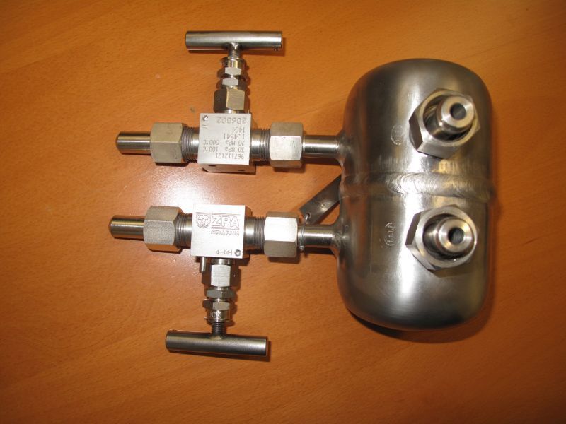 Kondenzační nádoba je na vstupní straně opatřena šroubením, popř. podle požadavku nátrubkem ukončeným přípravou pro svarový spoj na průměru 14 mm. Na výstupní straně je opatřena navařenými uzavíracími armaturami ukončenými přípravou pro svarový spoj na průměru 14 x 2,5 mm, popř. 12 x 1,5 mm. Na vyžádání lze kondenzační nádobu opatřit jiným procesním připojením.