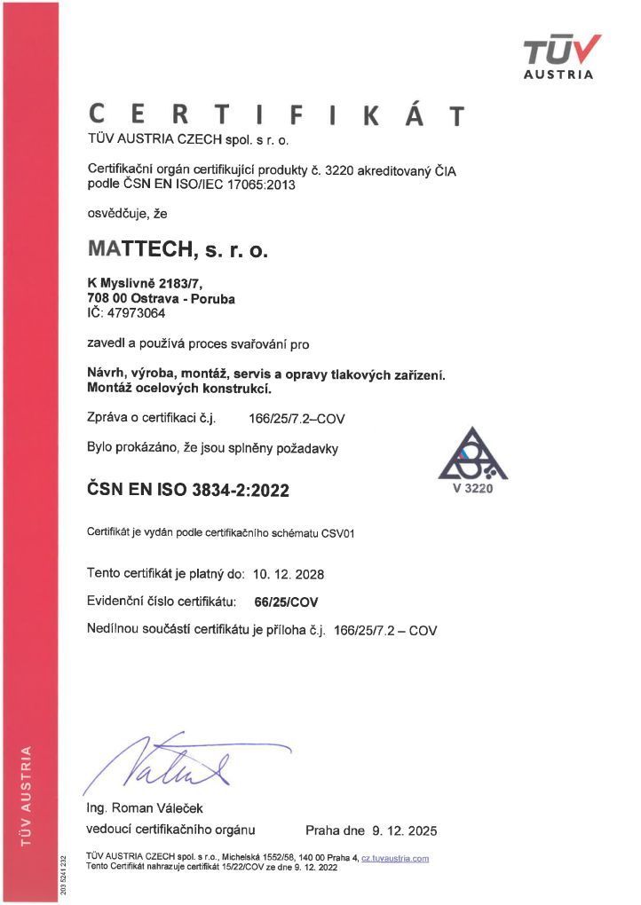 Im Jahre 2001 wurde in der Gesellschaft MATTECH, s.r.o. das Qualitätssystem eingeführt und von der britischen Firma Lloyd´s Register Quality Assurance erfolgreich zertifiziert. Im Laufe der Jahre 2002–2003 wurde die Gesellschaft schon vollkommen für die Herstellung von Druckteilen nach der Richtlinie PED 97/23 EC zertifiziert. Gegenwärtig ist das Qualitätssystem eingeführt und wird regelmäßig von der tschechischen Firma TÜV AUSTRIA CZECH überprüft.